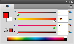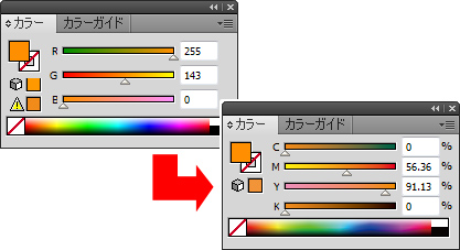 RGBで色を付けますとCMYKに変換した際に色に誤差が生じ、正しい色になりません。 |